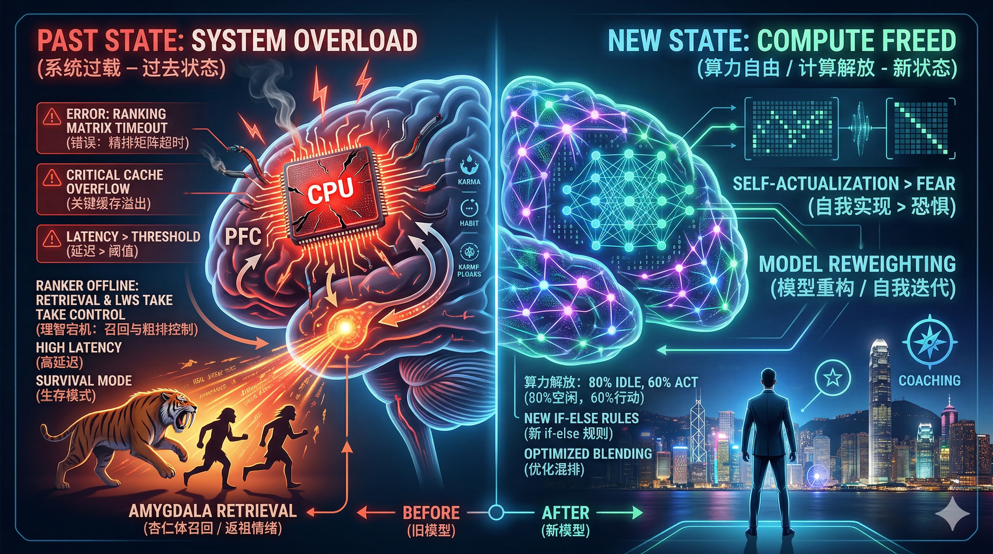 - 宕机状态: 算力是有限的。当你极度疲惫、愤怒或处于 Panic 时,精排模块会直接超时。系统为了保命,会跳过这一步。这就是为什么人在冲动时会做出“不经大脑”的蠢事。